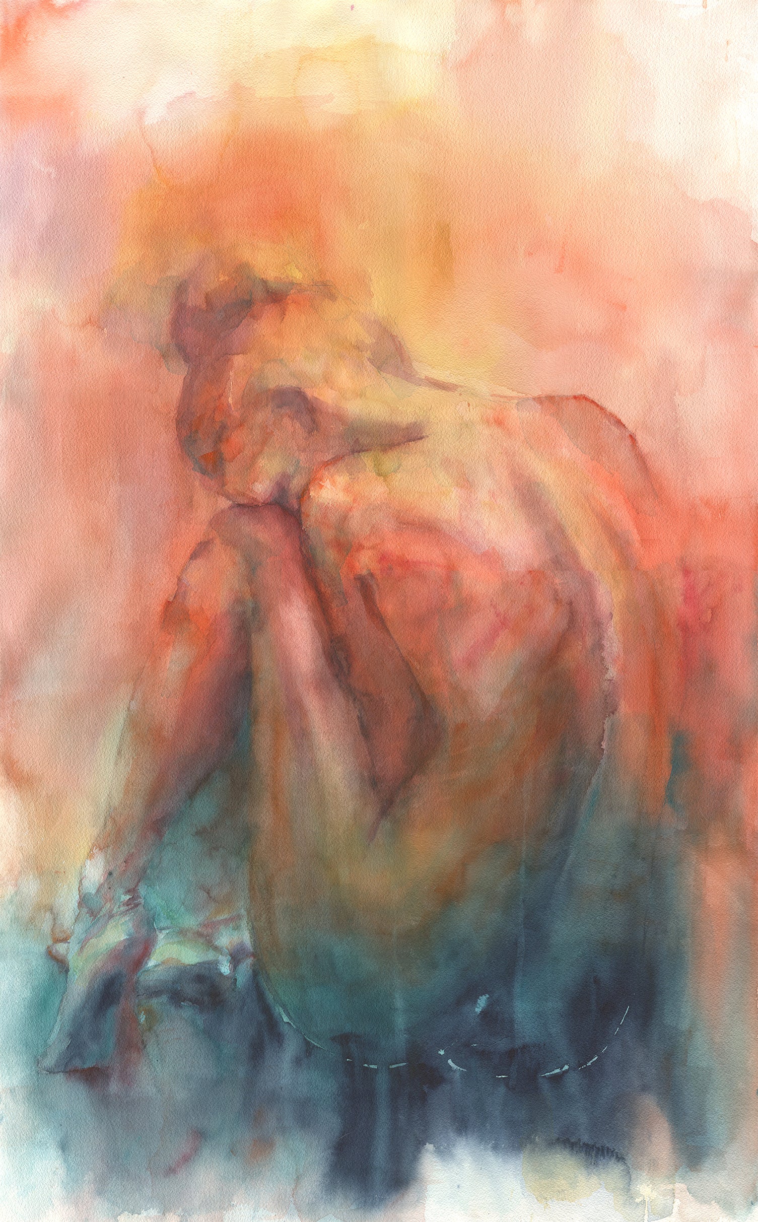 "Safer Within" captures the quiet intimacy of a solitary figure, curled in a moment of introspection. The soft, fluid strokes of watercolor evoke a sense of vulnerability and inner peace, as the figure finds solace within themselves. With gentle hues enveloping the form, the painting reflects the emotional sanctuary one can create when seeking refuge in their own presence. It’s a visual meditation on self-protection, comfort, and the quiet strength found in being alone.